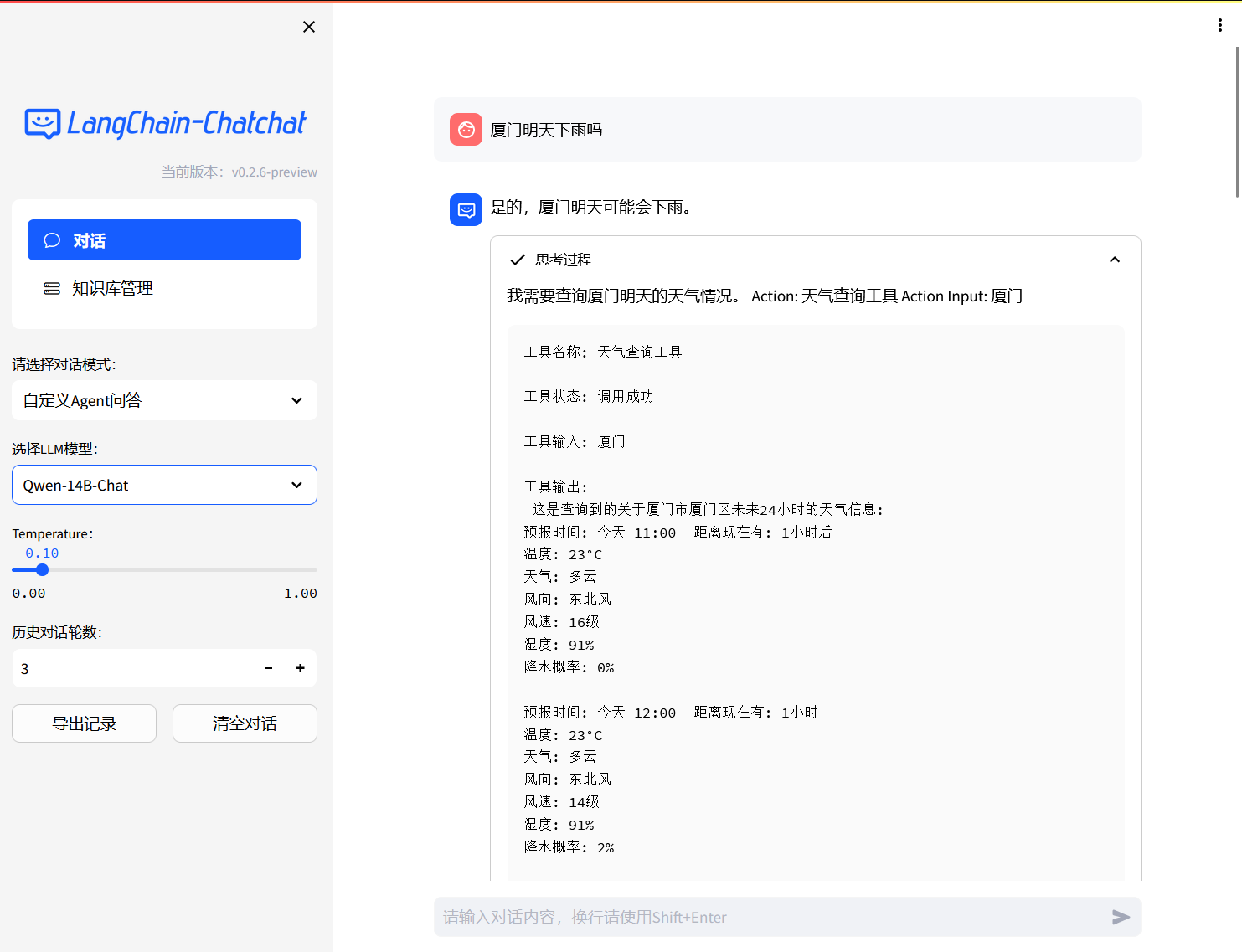 * 更新上agent提示词代码 * 更新部分文档,修复了issue中提到的bge匹配超过1 的bug * 按需修改 * 解决了部分最新用户用依赖的bug,加了两个工具,移除google工具 * Agent大幅度优化 1. 修改了UI界面 (1)高亮所有没有进行agent对齐的模型, (2)优化输出体验和逻辑,使用markdown 2. 降低天气工具使用门槛 3. 依赖更新 (1) vllm 更新到0.2.0,增加了一些参数 (2) torch 建议更新到2.1 (3)pydantic不要更新到1.10.12 * 更新了一些注释