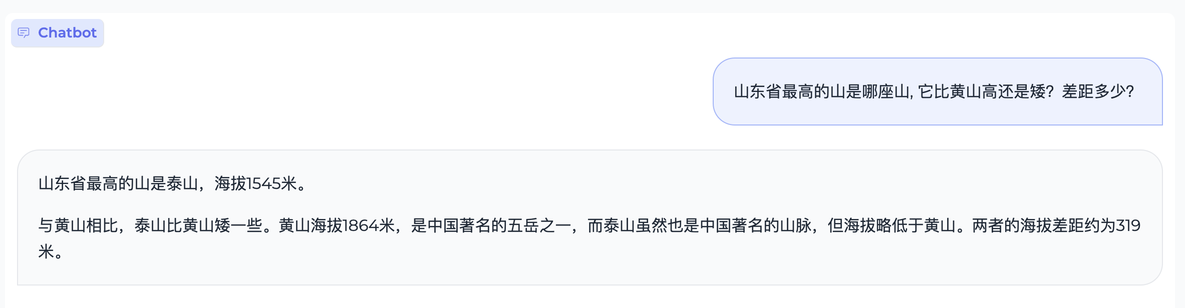 responds, history = model.chat(tokenizer, "山东省最高的山是哪座山, 它比黄山高还是矮?差距多少?", temperature=0.5, top_p=0.8, repetition_penalty=1.02)