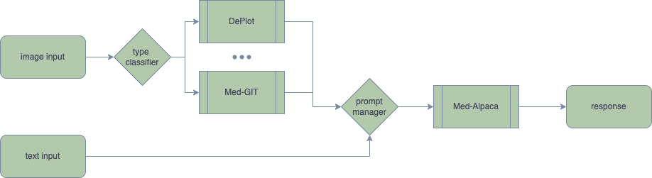 Visual Med-Alpaca bridges the textual and visual modalities through the prompt augmentation method. Firstly, the image input is fed into a type classifier to identify the appropriate module for converting visual information into an intermediate text format, which is then appended to the text inputs for subsequent reasoning procedures. For instance, medical plots are transformed into intermediate linearized tables through the use of the DePlot module. The prompt manager then merges the textual information extracted from images and text inputs into the prompt for Med-Alpaca, a large language model used for generating responses with the expertise in biomedical domain.